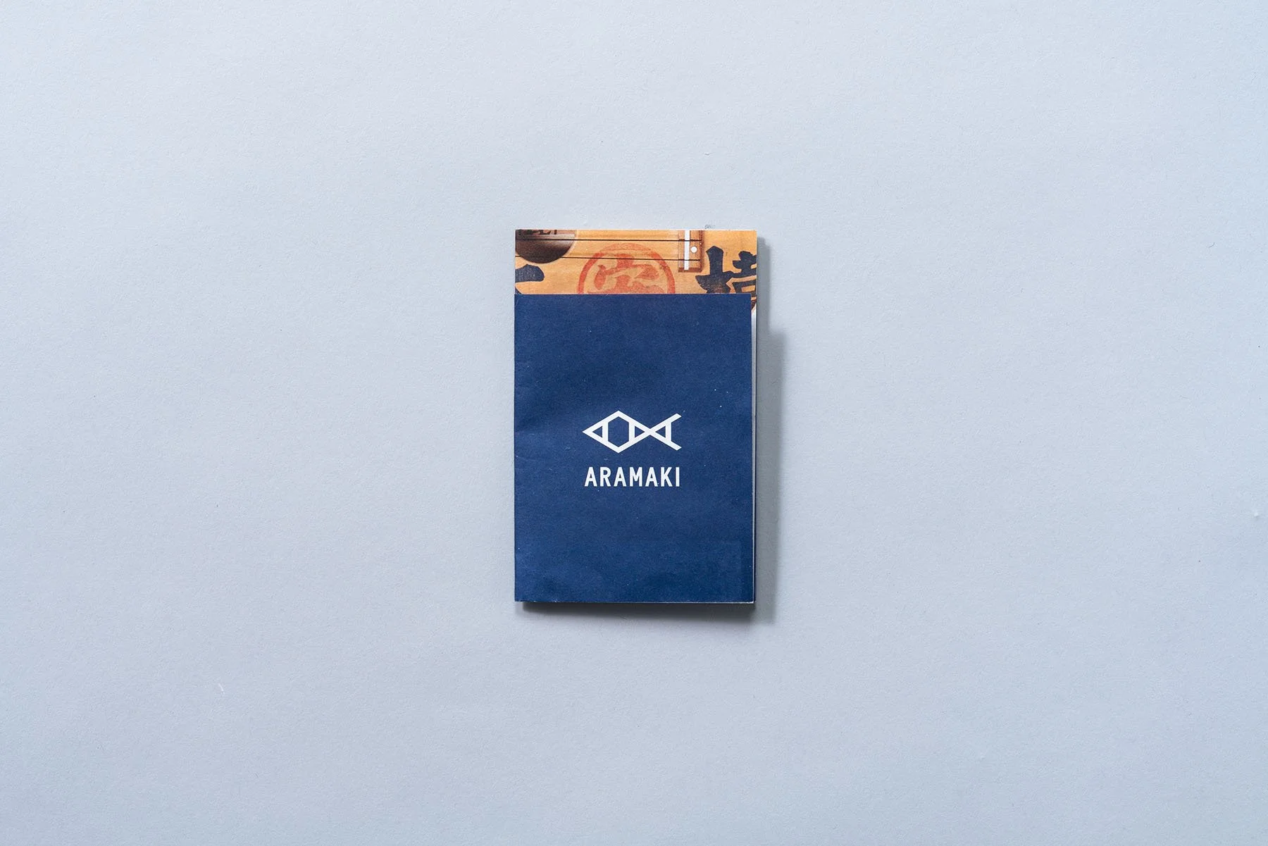 ARAMAKI’s product catalog. It is folded down to a compact size—perhaps so that it can fit even into the smallest product. The design draws on salmon-box motifs, incorporating red, blue, black, and stamp imagery.
